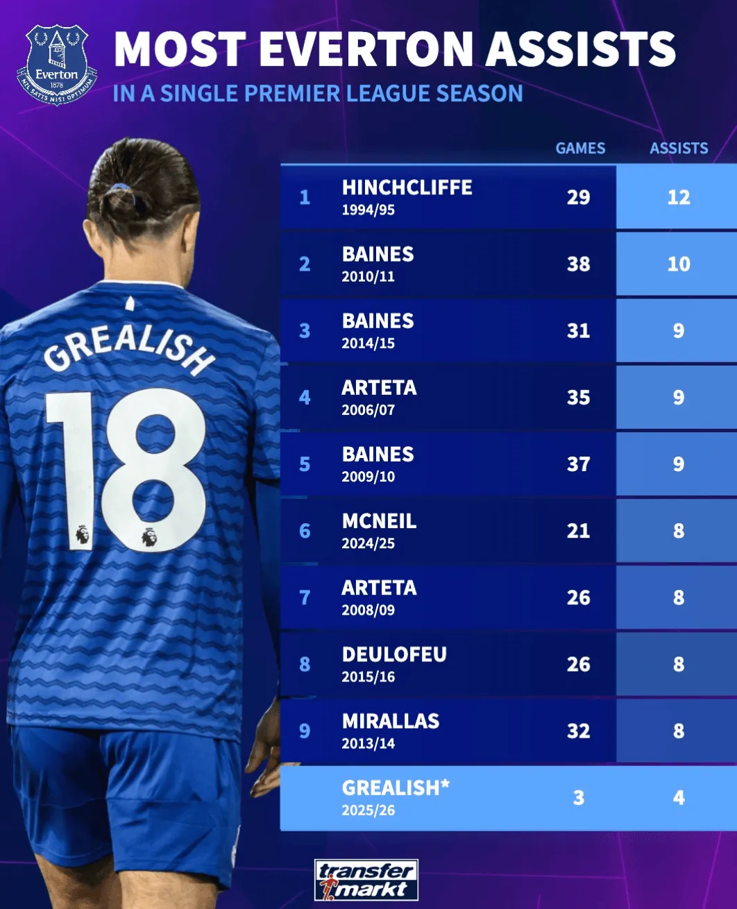 虎扑09月12日讯 德转统计了埃弗顿队内单赛季助攻王的榜单。其中球队功勋左后卫贝恩斯占据三席,现任阿森纳主帅阿尔特塔也两次上榜。