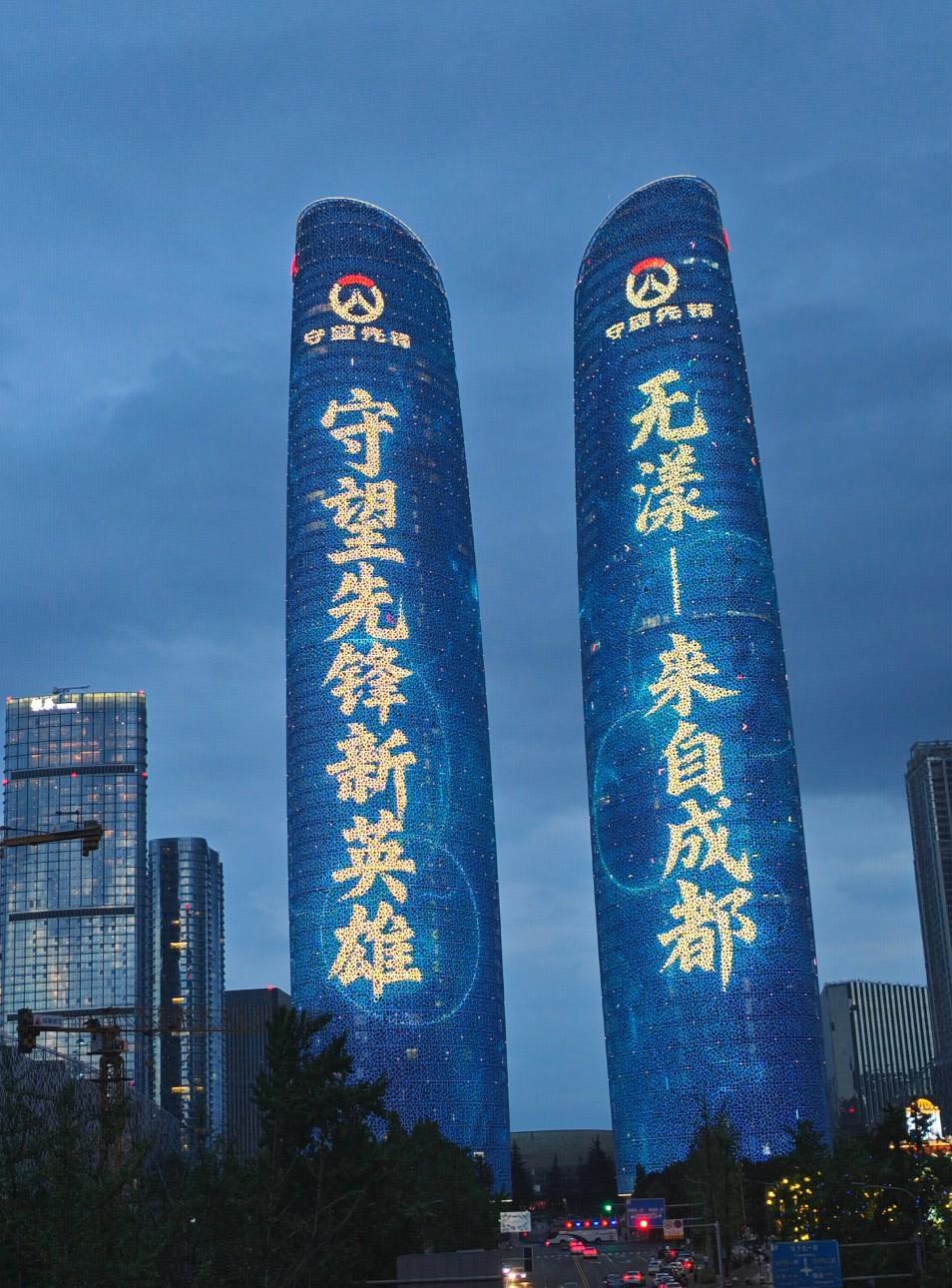 9月4日晚,成都地标建筑金融双子塔亮起了詹姆斯生涯主题的灯光秀。