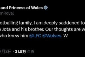 体育资讯7月4日讯 在若塔兄弟因车祸离世后,威廉王子和凯特王妃在共同的社交媒体账号上发文悼念了若塔兄弟。